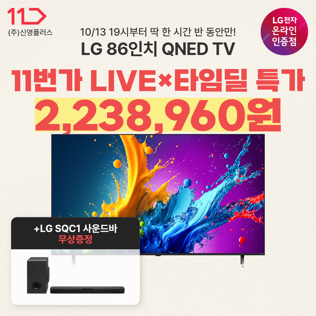 | 오늘 밤 9시! 11번가 LG TV 마지막 LIVE, 86인치 QNED TV 초핫딜!!! (0) | 2025.11.11 |