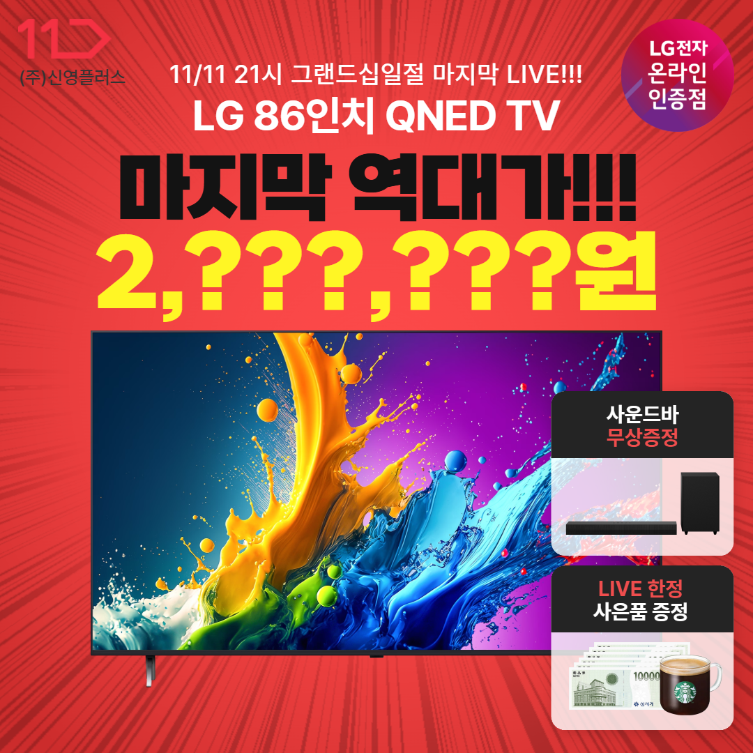 | 오늘 저녁 7시! 11번가 LG 86인치 QNED TV LIVE 특가가 찾아갑니다🏃♂️ (0) | 2025.10.13 |