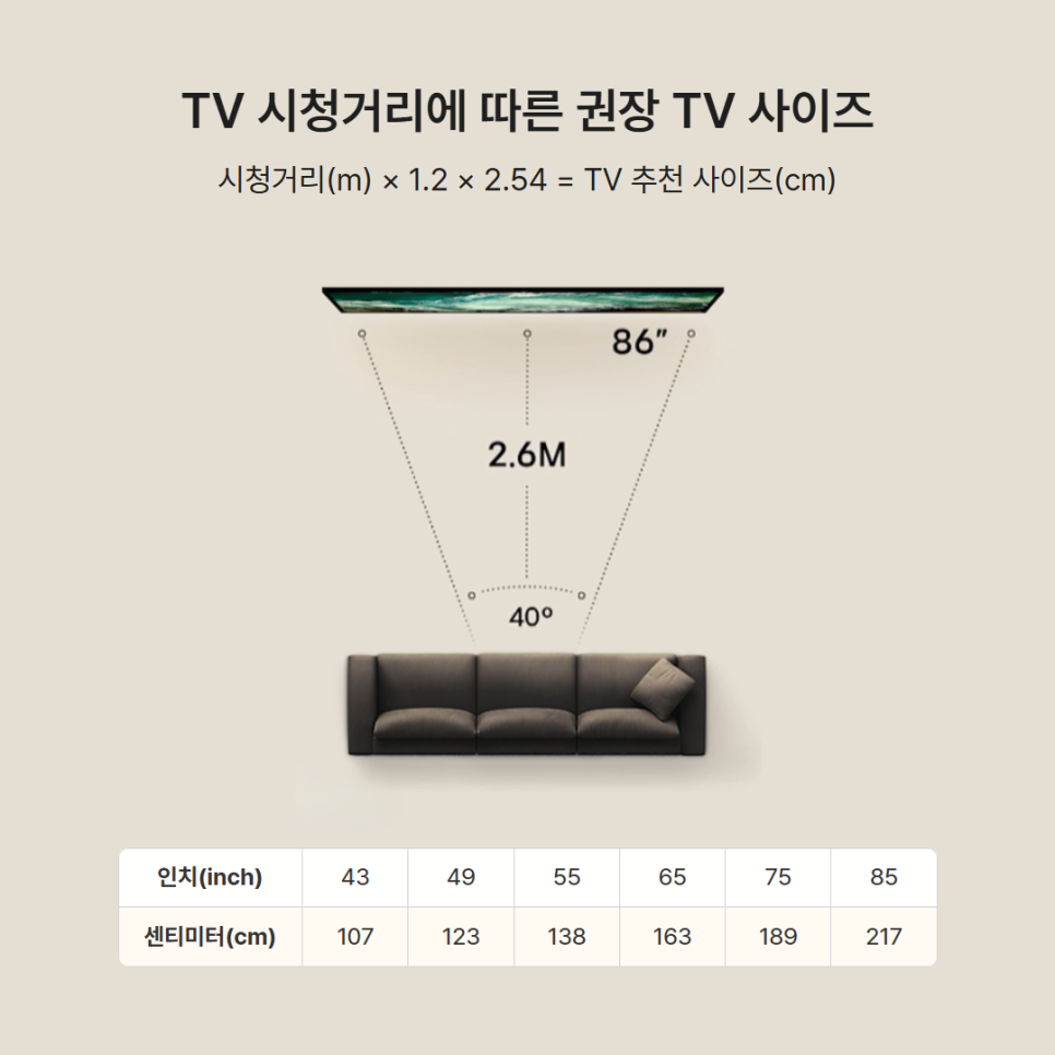 각 크기에 맞춰 최적의 시청 거리를 유지하면 편안한 시청 환경을 만들 수 있습니다.